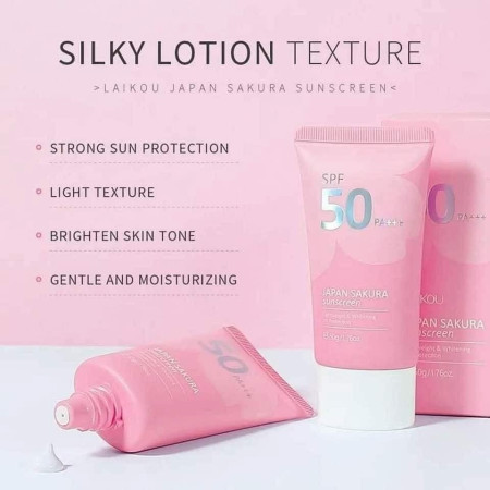LAIKOU JAPAN SAKURA SUNSCREEN যুক্ত ত্বকের টোন উজ্জ্বল করতে পারে এবং ত্বককে টানটান করতে পারে। এটির দীর্ঘস্থায়ী UV সুরক্ষা রয়েছে এবং কার্যকরভাবে রোদে পোড়া প্রতিরোধ করতে পারে। মসৃণ এবং লোশন টেক্সচারের সাথে, এটি অ-চর্বিযুক্ত এবং ত্বকের পৃষ্ঠে দ্রুত একটি প্রতিরক্ষামূলক ফিল্ম তৈরি করতে পারে। সোডিয়াম হায়ালুরোনেট, হাইড্রোলাইজড রাইস প্রোটিন এবং সেন্টেলা এশিয়াটিকা এক্সট্র্যাক্টের উপাদানগুলির সাথে, এটি আপনার ত্বককে মসৃণ এবং উজ্জ্বল করে, সূর্যের আলোতে আর্দ্রতা হ্রাস থেকে ত্বককে মুক্তি দিতে পারে।